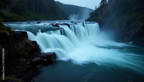 © neni, Fototapeta premium Powerful cascading waterfall plunges into vibrant teal river surrounded by dense green forest under a moody twilight sky