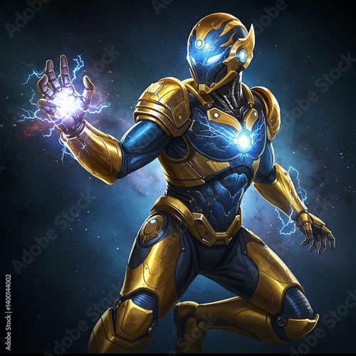 © Farjana, Naklejka premium Powerful Cosmic Hero Gold Blue Armor Harnessing Energy Dynamic Pose Dark Background