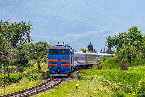 Naklejka premium Powerful diesel locomotive pulls passenger train. Railway in the mountains.
