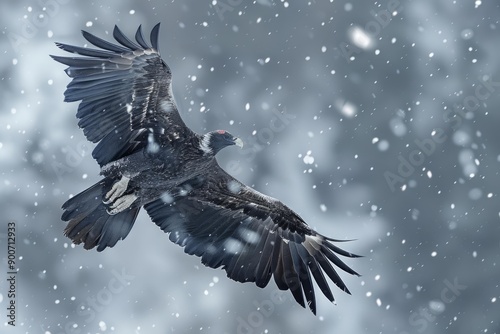 Naklejka premium Powerful eagle soars amid a tranquil snowfall, showcasing the grace of nature