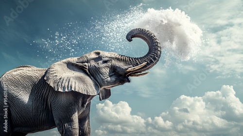 Obraz premium Powerful Elephant Spraying Water Against Dramatic Cloudy Sky