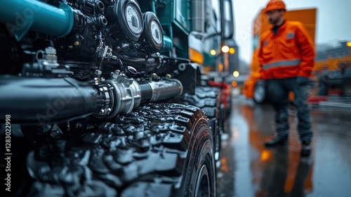 © muhammad, Fototapeta premium Powerful Engine Close-up: Industrial Truck Detail in Wet Conditions