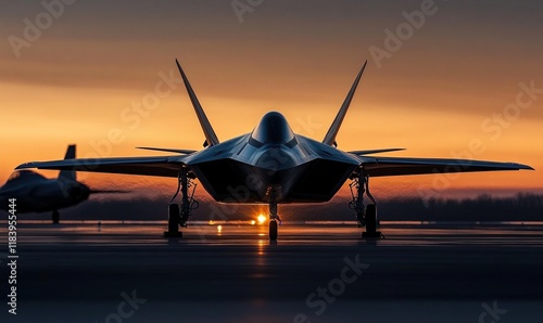 © FocusFusion, Fototapeta premium Powerful fighter jet stands on airport tarmac during sunset with impressive silhouette and strong presence