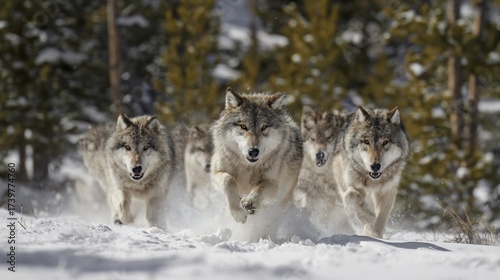 Naklejka premium Powerful Gray Wolf Pack Running Through Deep Winter Snow, Kicking Up Powder in a Forest