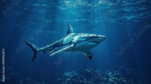Fototapeta premium Powerful Great White Shark Gliding Through the Mysterious Blue Depths of the Ocean
