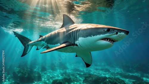 © Cyber Shutter, Obraz premium Powerful great white shark moving in the deep blue waters with rays of sunshine