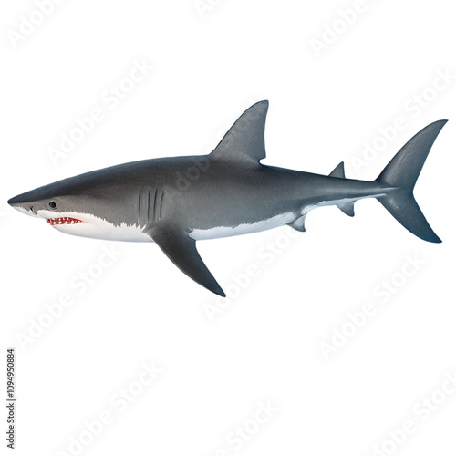 © Raul, Fototapeta premium Powerful great white shark swimming in dark blue water. Predatory marine animal.