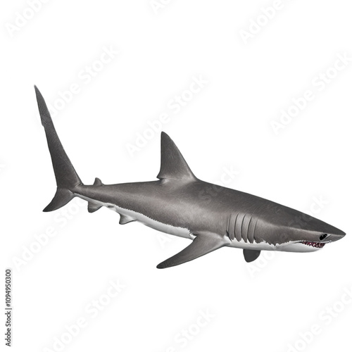 © Raul, Fototapeta premium Powerful great white shark swimming in dark waters. A detailed 3D render showcasing the marine predator's sleek form and sharp teeth.