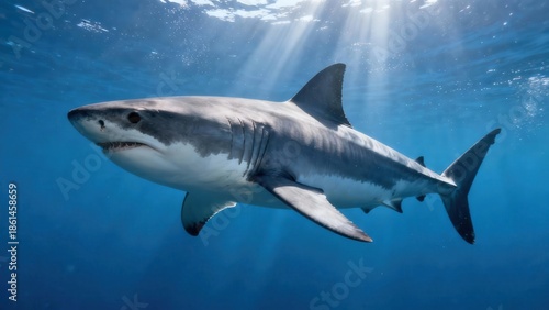 © ibhonk, Fototapeta premium Powerful Great White Shark swimming underwater in the deep blue ocean illuminated by bright surface sunbeams.