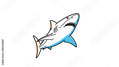 Fototapeta premium Powerful Great White Shark swimming upwards with its mouth open and sharp teeth visible in a dynamic and clean cartoon illustration.