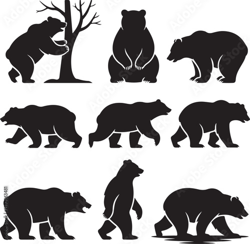 © vector, Naklejka premium Powerful Grizzly Bear SilhouetteGentle Brown Bear IllustrationMajestic Wild Bear VectorMinimalist Polar Bear DesignFierce Black Bear Outline