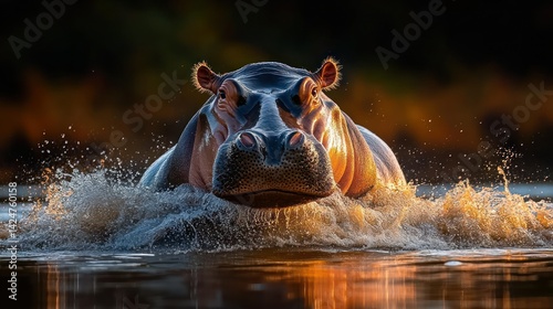 © RONNY, Fototapeta premium Powerful hippopotamus emerges from water