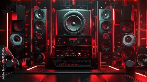 Fototapeta premium Powerful home theater stereo system with red lights.