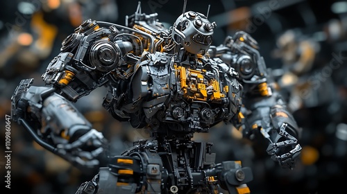 Fototapeta premium Powerful industrial robot, metallic gray, intricate design, glowing orange...