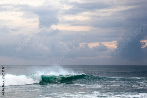 © Maria, Fototapeta premium Powerful isolated green wave breaking during sunset with offshore winds in Bali, Indonesia.