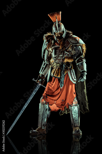 Fototapeta premium Powerful knight in the armor with the sword. Isolated on black background.