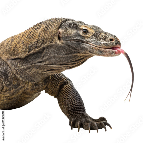 © DigitalDreamScapes, Obraz premium Powerful komodo dragon reptile lizard with forked tongue tasting air. Scary wildlife animal predator in close up portrait, isolated view