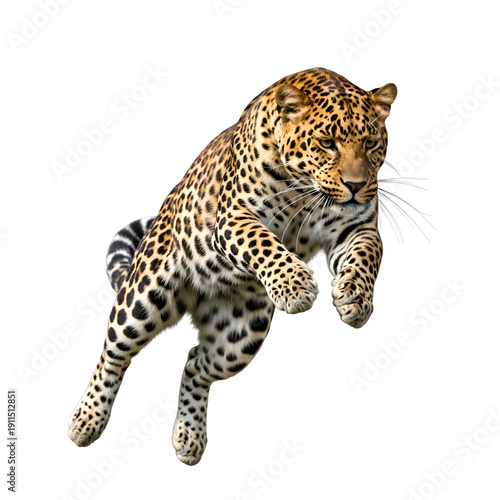 © ibrahimmaryam, Fototapeta premium Powerful Leopard Pouncing Isolated White Background on white background, Isolated on Transparent Background