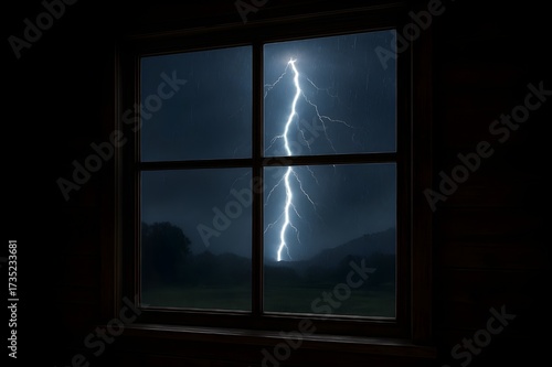 © Randika, Fototapeta premium Powerful Lightning Bolt Illuminates Rainy Countryside