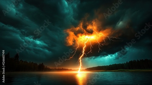 © Ika, Obraz premium Powerful lightning strike over lake during dramatic storm