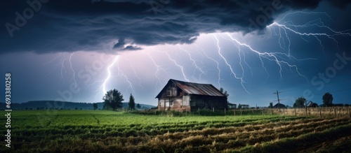 © AkuAku, Fototapeta premium Powerful lightning strikes nearby in rural Transylvania, Romania.