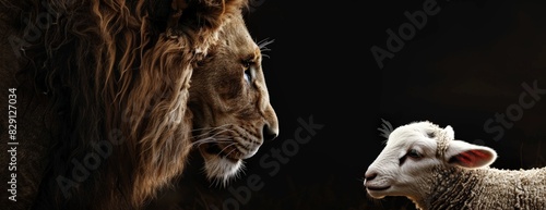Naklejka premium Powerful lion and innocent lamb