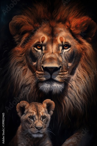 © Nld, Fototapeta premium Powerful Lion with Adorable Cub - Generative ai