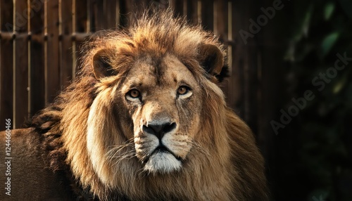 Obraz premium Powerful Majesty A Close Encounter with a Regal Lion in the Heart of the Zoo,...
