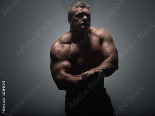 Fototapeta premium Powerful muscular bodybuilder posing on a black background. concept of strength and health