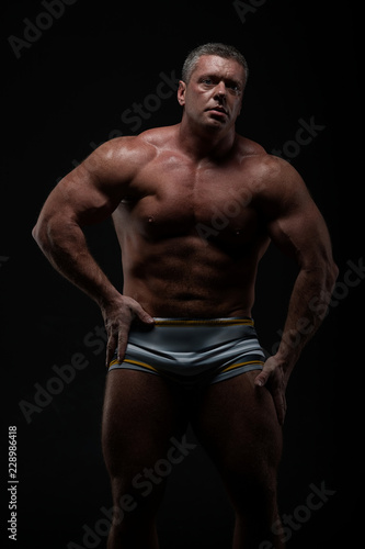 Fototapeta premium Powerful muscular bodybuilder posing on a black background. concept of strength and health