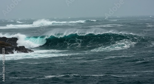 © elmo, Fototapeta premium Powerful Ocean Wave Crashing Against Rocky Shoreline