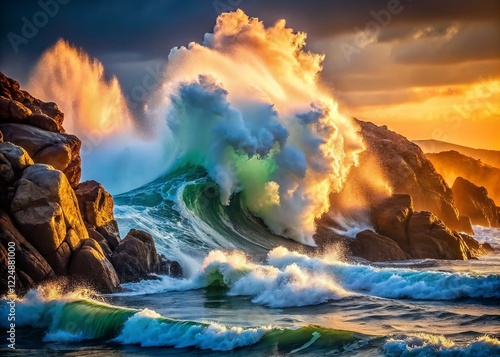 © Four888, Naklejka premium Powerful Ocean Wave Crashing on Rocky Shore - Dramatic Nature Photography