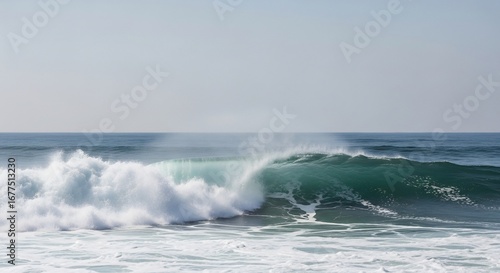 © rakhul, Fototapeta premium Powerful Ocean Wave Crashing with Foamy Spray Under Pale Sky