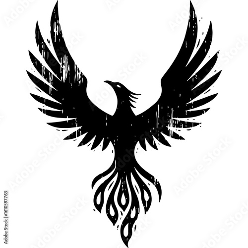 Obraz premium Powerful Phoenix Bird Silhouette in Rustic Woodcut Style. Distressed...
