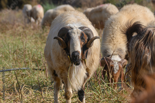 © Михаил Шорохов, Naklejka premium Powerful Ram with Sheep on a Cyprus Pasture