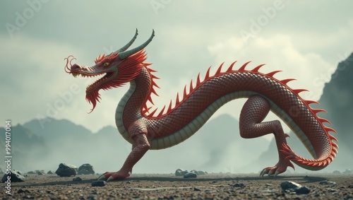 © Cornflakesei, Obraz premium Powerful Red Dragon in a Misty Mountain Landscape