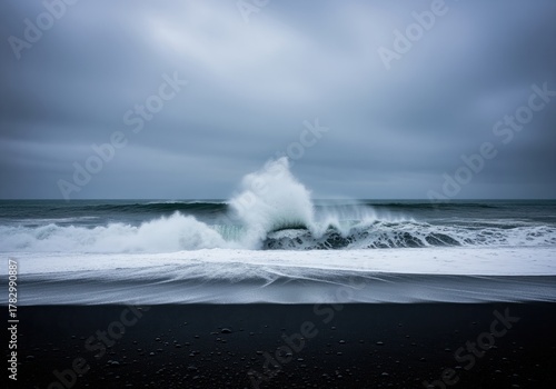 © Meow Creations, Fototapeta premium Powerful sea wave breaking on dark volcanic sand beach under a dramatic stormy sky