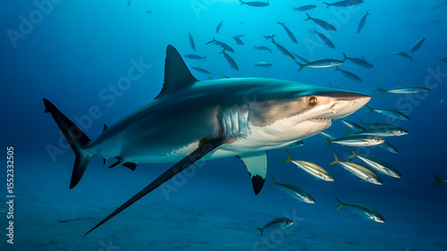 Fototapeta premium Powerful shark surrounded by schooling fish.