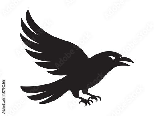 Obraz premium Powerful silhouette of a raven in flight against a white background.
