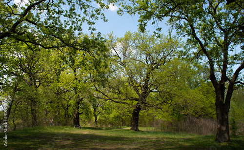 © Lyudmyla, Fototapeta premium Powerful tall green oaks in a meadow in early spring