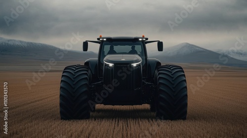 Fototapeta premium Powerful tractor on farmland with dramatic mountain background