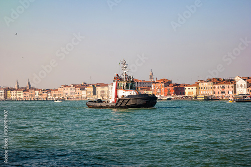 Obraz premium Powerful tugboat for cruise liners sailing in Venetian Lagoon