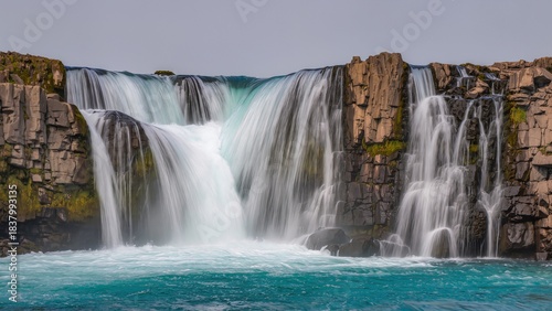 © KJIAUS, Fototapeta premium Powerful Waterfall Over Basalt Cliff into Turquoise Pool