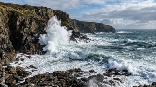 Fototapeta premium Powerful Waves Crash Against Rocky Coastline Under Dramatic Sky and Bright...