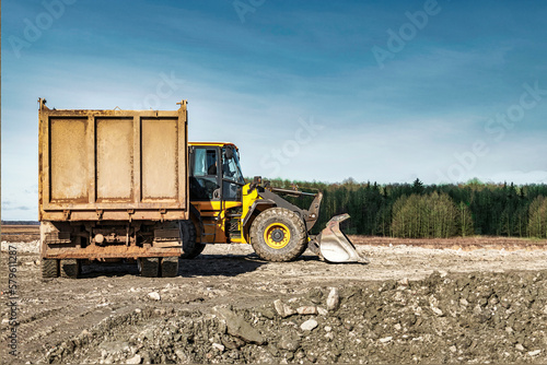 Obraz premium Powerful wheel loader or bulldozer working on a quarry or construction site. Earthworks in construction. Powerful modern equipment for earthworks.