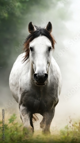 © Michael, Fototapeta premium Powerful white horse gallops through misty landscape in soft morning light during a peaceful rural setting