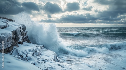 © Mnur, Fototapeta premium Powerful winter waves crashing against a snowy cliff.