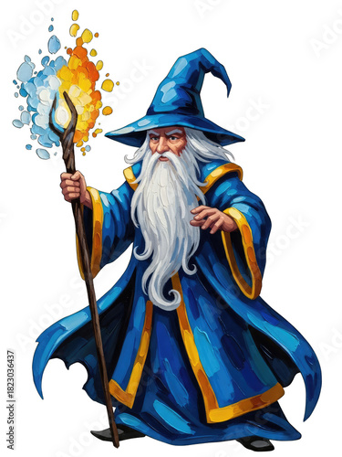 Fototapeta premium Powerful Wizard Casting a Spell with Magical Staff.