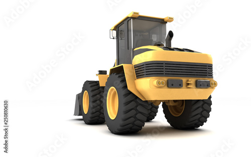© Evgenii Iakovenko, Fototapeta premium Powerful yellow wheel hydraulic bulldozer with black bucket isolated on white. 3D illustration. Perspective. Rear view. Low wide angle. Left side.
