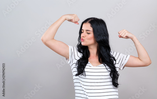 Fototapeta premium Powerful young woman in a success pose on a gray background